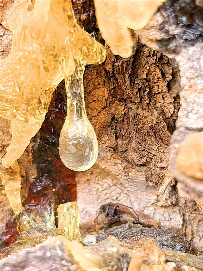 这带着清苦松香的汁液顺着沟壑缓缓流淌,像温柔的泪滴,迅速覆盖住创口。接触到空气后,树脂里的油分慢慢挥发,原本柔软的液体便凝作半透明的胶块,像给树的伤口敷上了一层防水、抗菌的保护膜。